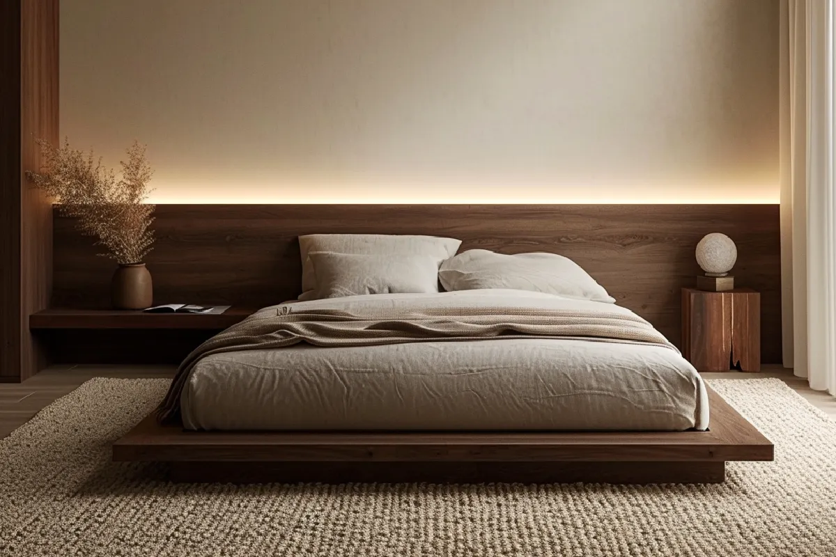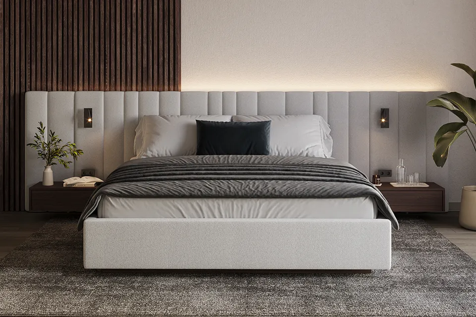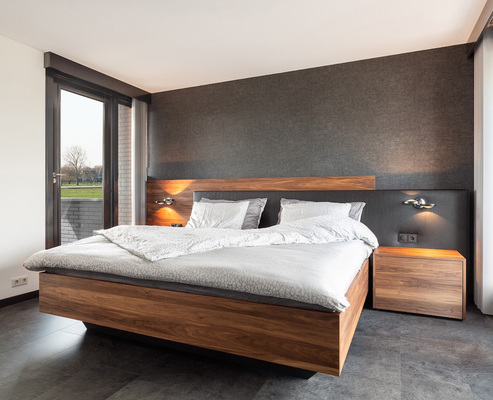 Voor Esther en Bas maakten we een design bed op maat met zijpanelen en zwevende nachtkastjes. Dit bed combineerden we met een stijlvolle, op maat gemaakte draaideurkast.