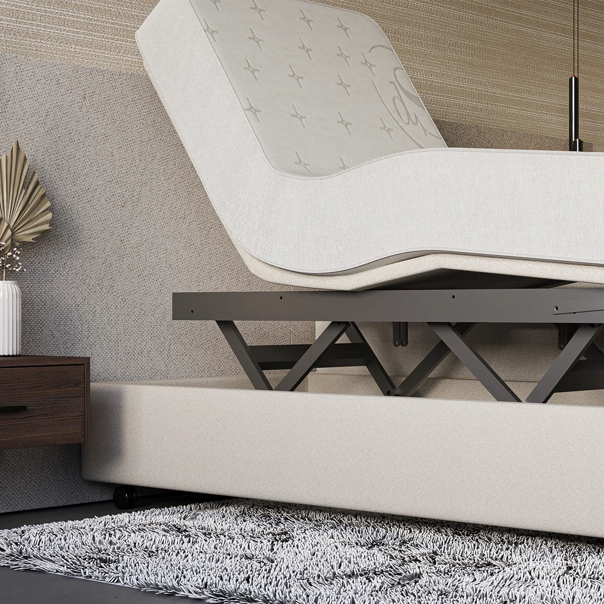 Hoog laag bed Essence met aan één bedzijde een hoog-laag functie inclusief elektrisch verstelbaar hoofd- en voeteinde, en aan de andere zijde een vlakke bed. Bekijk deze combinatie