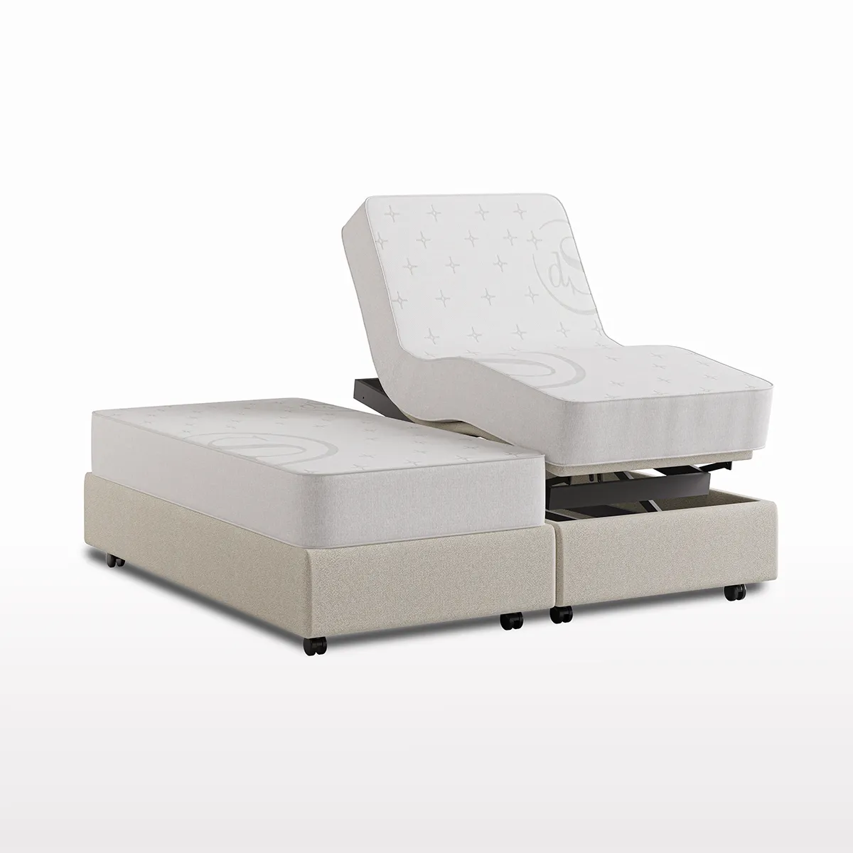 Hoog-laag bed hybride met één zijde hoog-laag verstelbaar (met elektrische rug- en beenverstelling) en de andere met alleen elektrische rug- en been verstelling.