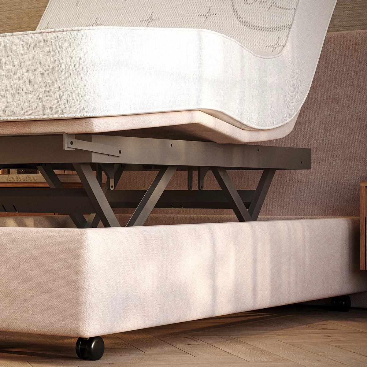 Dit hoog laag bed van 120 cm breed combineert de functionaliteit van een zorgbed met de luxe uitstraling van een boxspring. Het bed is standaard voorzien van een breed hoofdpaneel en nachtkastjes aan beide zijden. De prijs is exclusief matras, maar we kunnen u uitstekend helpen met een maatwerk matras dat volledig is afgestemd op uw wensen en het bed.