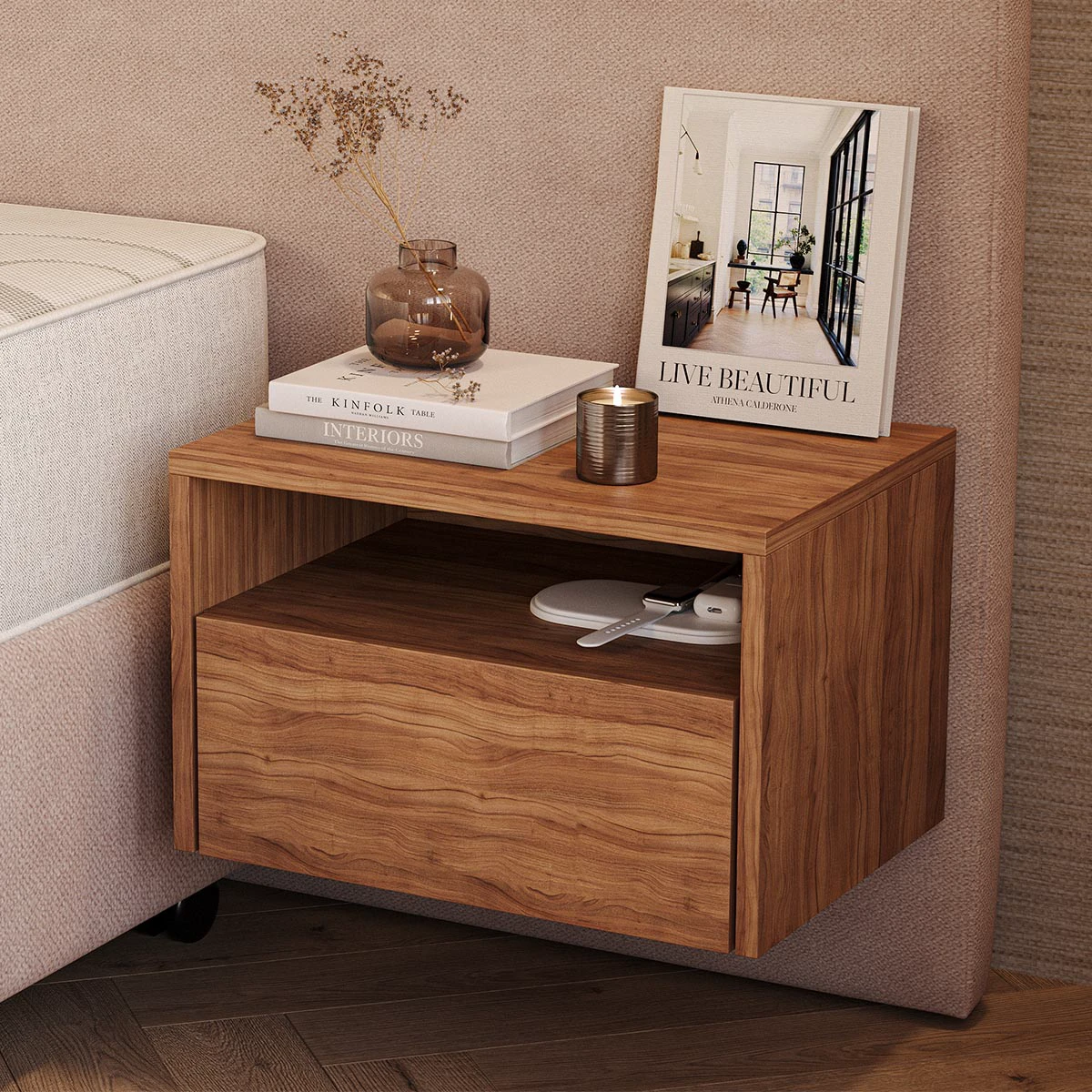 Twee zwevende nachtkastjes van 45x40x32 cm, met een lade en open vak. Andere maten en uitvoeringen met extra laden zijn mogelijk. In vele kleuren hout verkrijgbaar, krasvast en eenvoudig schoon te maken.