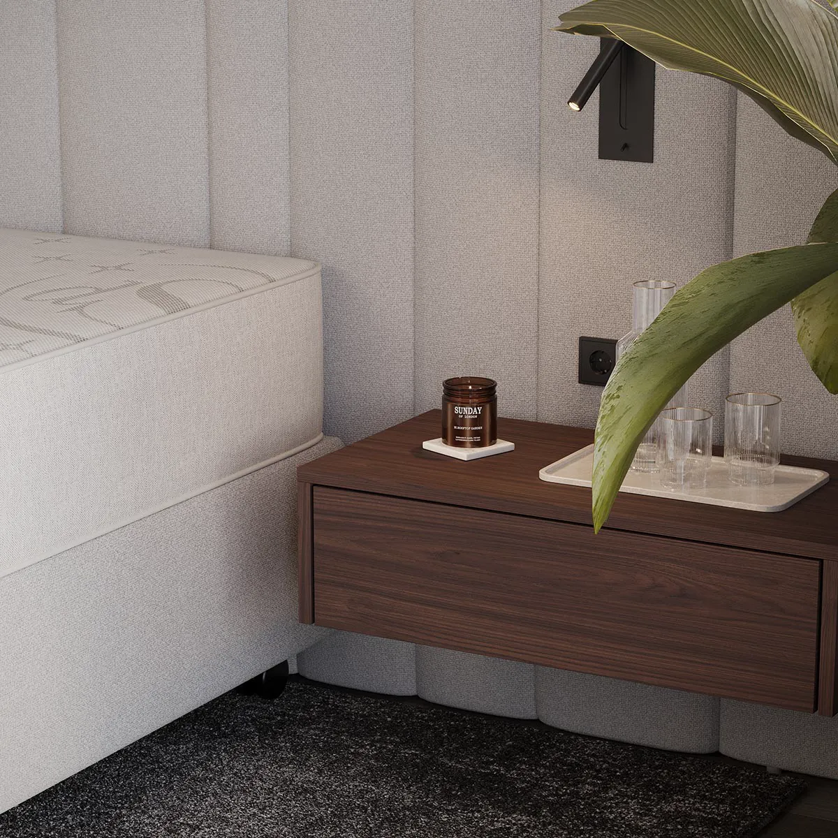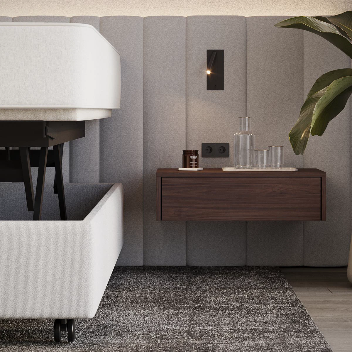 Daarnaast bieden we een ruime keuze in nachtkastjes, zowel op de vloer als zwevend, inclusief ingebouwde verlichting, bedlampen en leeslicht. Het model Ferrara vormt zo een stijlvolle en praktische basis, die u geheel naar eigen wens kunt uitbreiden.